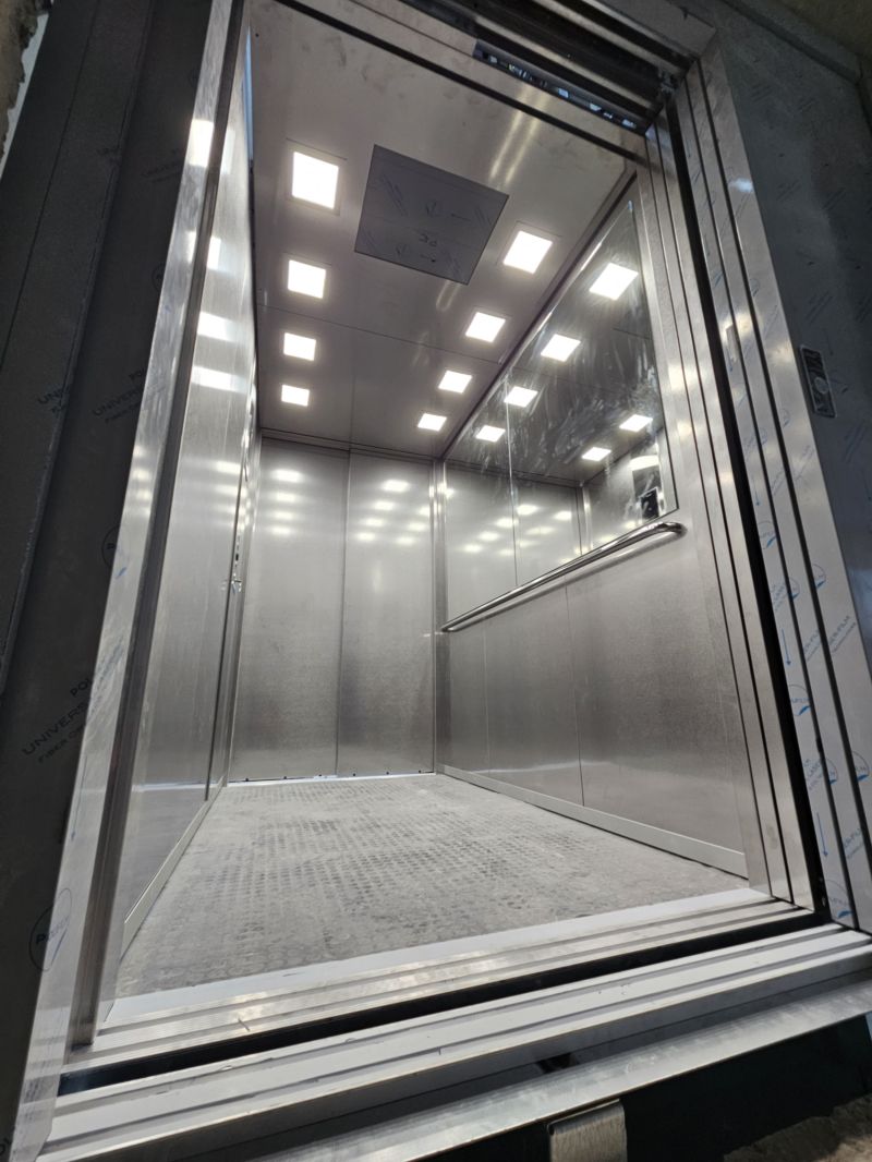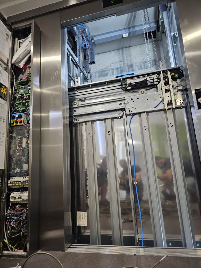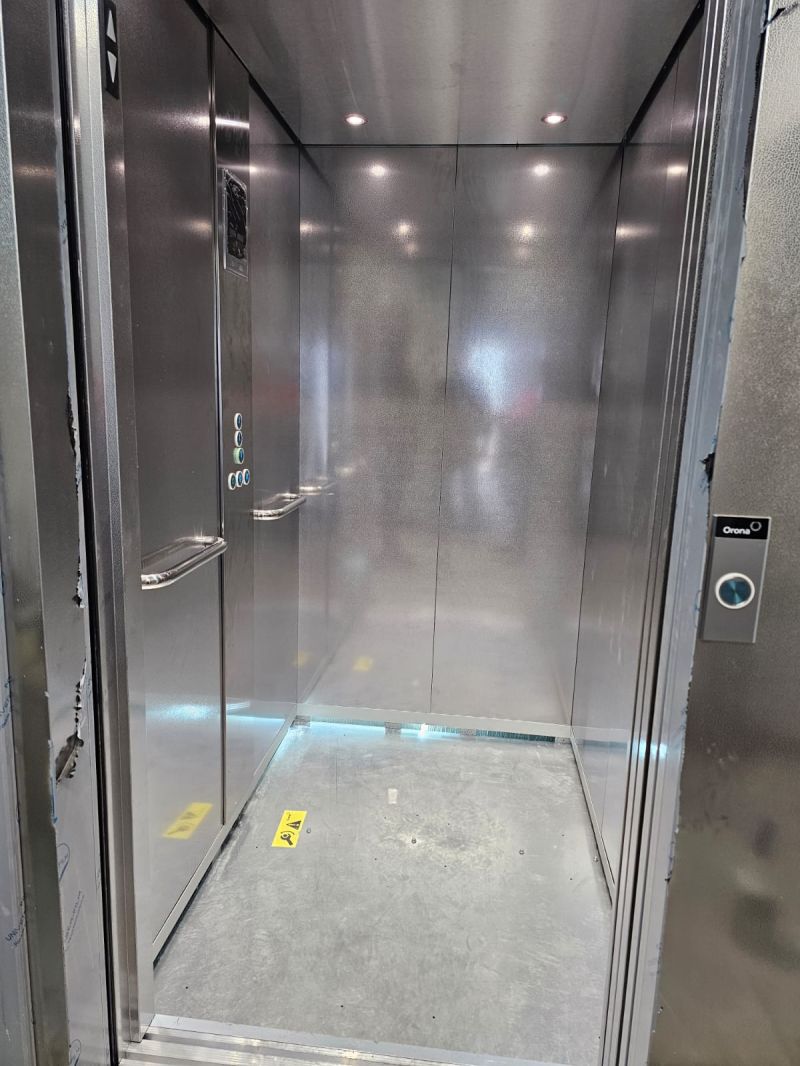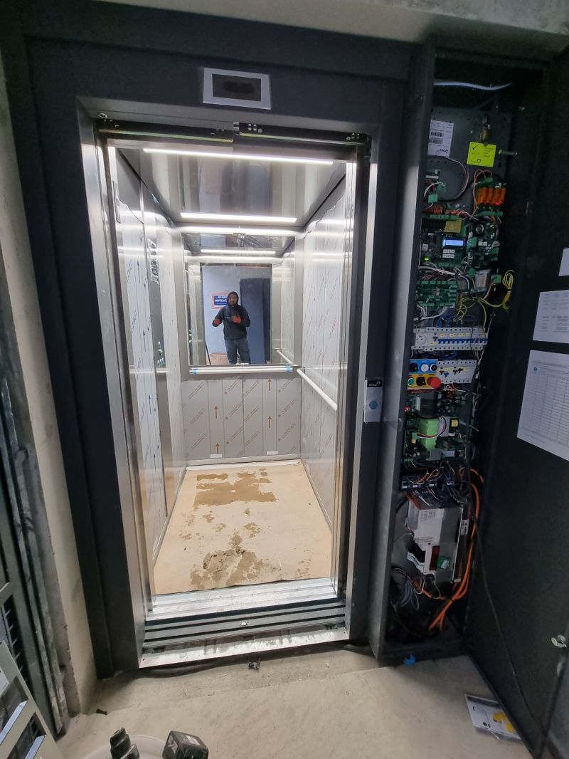 Installation d'un Orona X10 de 630kg et 3 niveaux, équipé d'une cabine Inox.