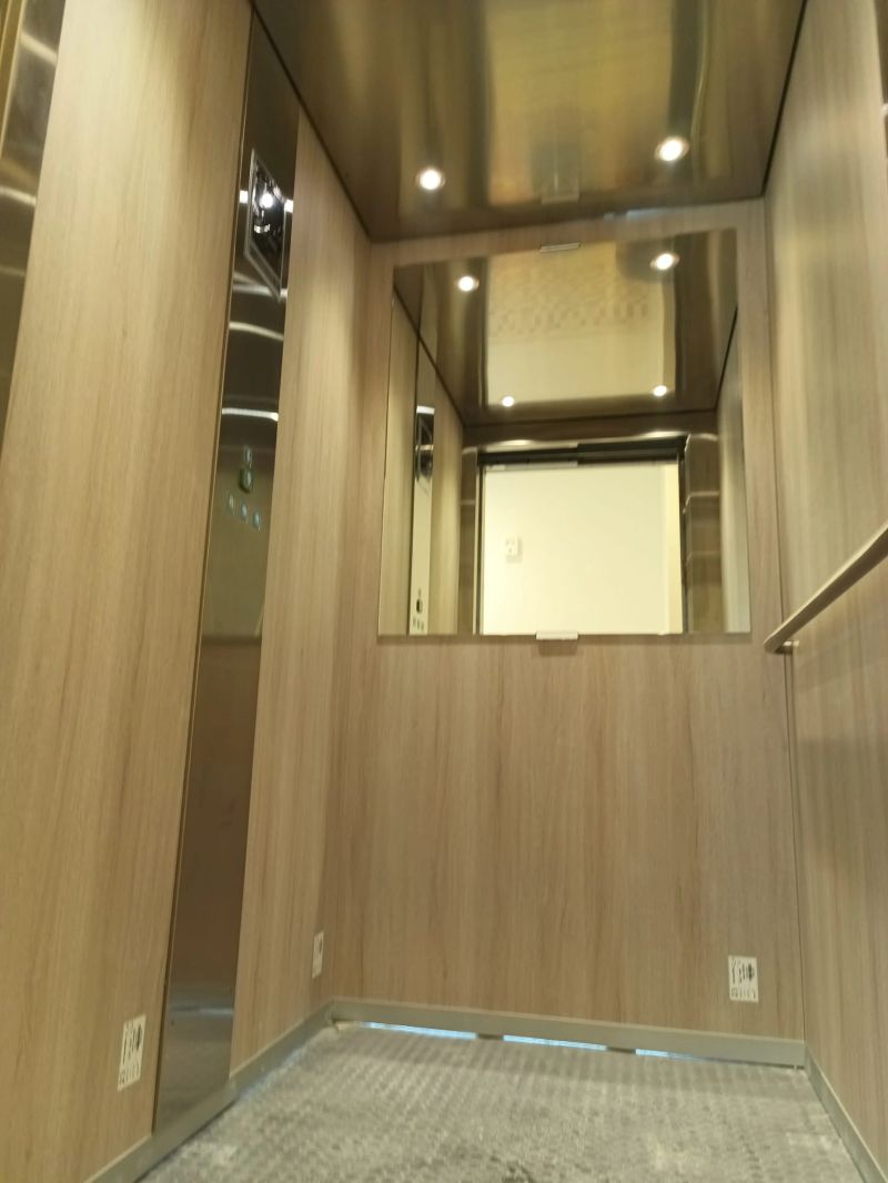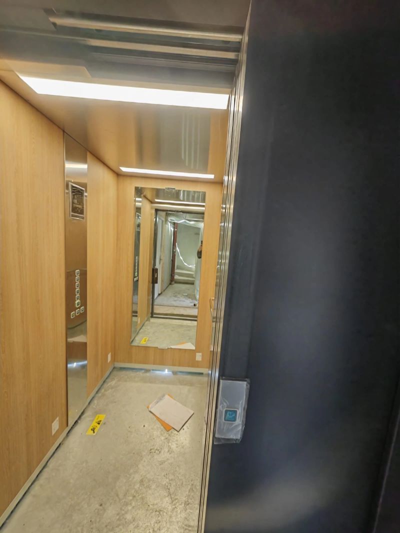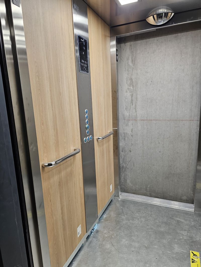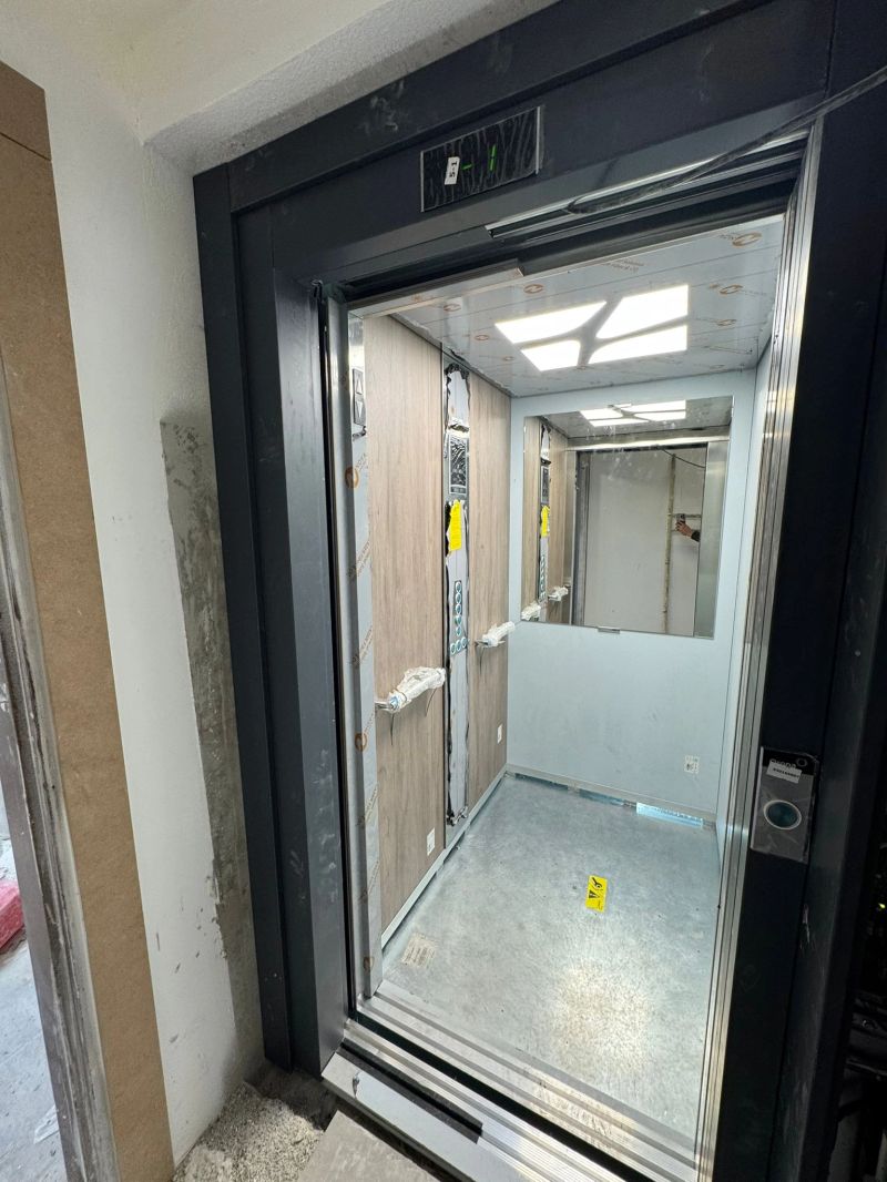 Installation d'une ascenseur ORONA 630kg 7 niveaux double accès avec une cabine noir/bois.